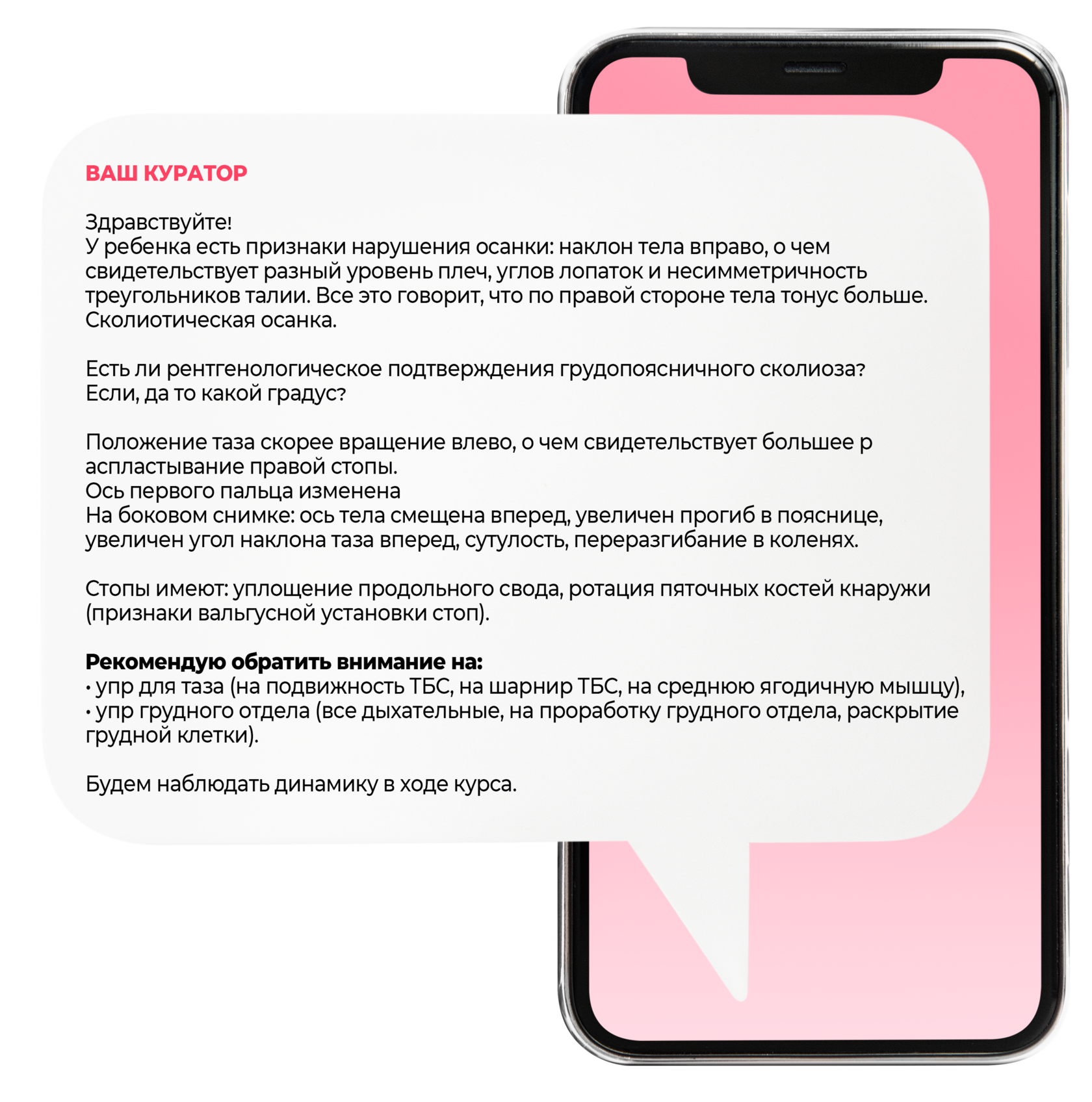Вы получаете полноценную продуманную до мелочей, трехмесячную программу по коррекции нарушений осанки и неправильной постановки стоп у детей, где с вами работает от двух до пяти специалистов не менее чем с 18 летним стажем в своем направлении. Вы станете эффективно заниматься с ребенком дома и перестанете ходить по больничным коридорам, стоять в очередях, водить на ежедневные тренировки и ждать по часу, а также избавляет от необходимости тратить огромные деньги на всевозможные ортопедические гаджеты.